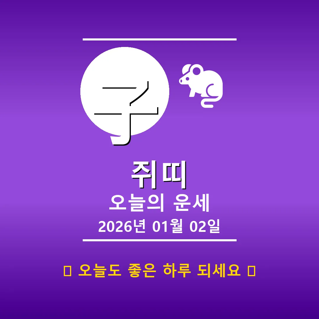 오늘 쥐띠 여러분, 2026년 1월 2일은 무술일(戊戌日)로 토(土) 기운이 강하게 들어오는 날입니다. 특히 사주에 토(土)가 많으신 분들은 안정감이 느껴지는 하루가 되겠지만, 반대로 금(金) 기운이 필요한 분들은 다소 답답함을 느낄 수도 있습니다. 하지만 걱정 마세요! 오늘 하루, 긍정적인 마음으로 차분하게 보내면 좋은 결과가 있을 거예요.